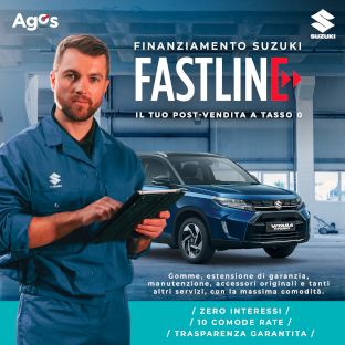 La richiesta di FASTLINE Suzuki è soggetta all’approvazione di Agos Ducato S.p.A. Messaggio pubblicitario con finalità promozionale. Per le informazioni precontrattuali richiedere sul punto vendita il modulo “Informazioni europee di base sul credito ai consumatori” (SECCI), la brochure informativa e la copia del testo contrattuale. L’offerta si riferisce alla linea di credito revolving a spendibilità limitata FASTLINE, utilizzabile esclusivamente per effettuare acquisti abbinati a campagne promozionali presso i punti vendita della rete ufficiale Suzuki. Decorsi 30 gg. dal primo acquisto FASTLINE può poi essere utilizzata per ulteriori acquisti presso i medesimi punti vendita della rete ufficiale Suzuki in funzione della disponibilità residua del fido accordato e dei rimborsi effettuati. Per effettuare ogni utilizzo di FASTLINE è richiesta la sottoscrizione di un voucher riportante il bene acquistato con il relativo prezzo e il TAN promozionale di rimborso ad esso applicabile, determinato in base alla campagna promozionale attiva al momento di ciascun utilizzo. Il TAN promozionale è sempre inferiore al TAN contrattuale indicato quale soglia massima. Offerta valida dal 01/03/2026 31/03/2026. Suzuki opera quale intermediario del credito NON in esclusiva.