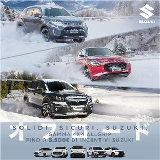 *IPT, PFU ed eventuali spese di rottamazione esclusi - presso i concessionari aderenti. La valutazione di eventuali vetture in permuta sarà effettuata in sede di sottoscrizione del contratto. Prezzo promo chiavi in mano calcolato con: incentivo Suzuki. L’offerta è applicabile per tutti i contratti stipulati dal 01/04/2026 al 30/04/2026. Verfica le promozioni di ogni singolo modello sul sito Suzuki.it . Verifica sempre sui siti ufficiali delle autorità competenti la disponibilità dei fondi e il possesso dei requisiti per accedervi.